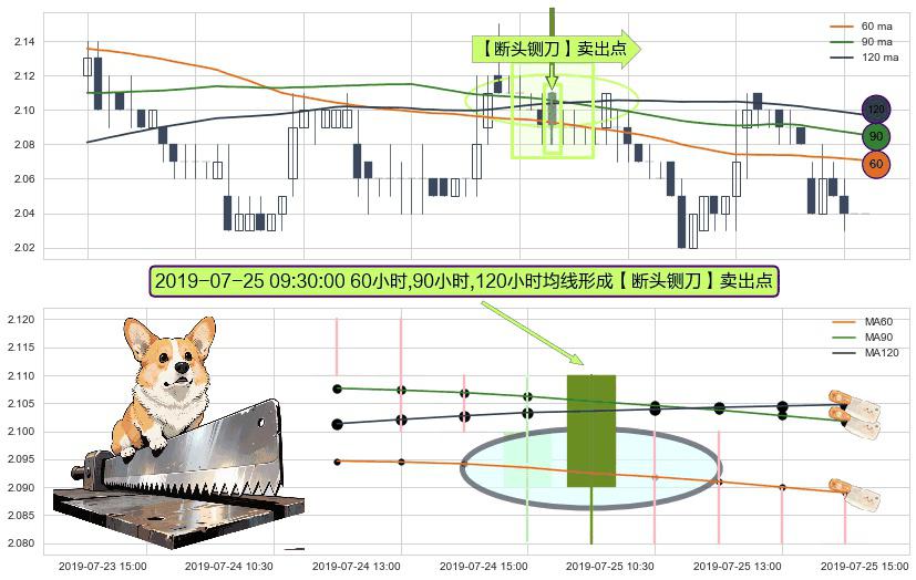 形态多维评估: ⚀ 2019-07-25 09:30:00小时显现 60小时-90小时-120小时均线 【断头铡刀】卖出点 看空信号,后市看跌,卖出