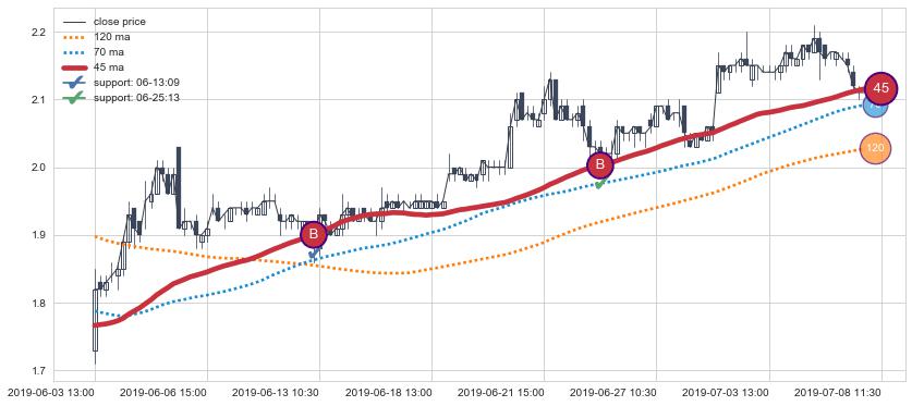 上涨趋势06-03 13:00-07-08 11:30,均线45确认关键支撑2处