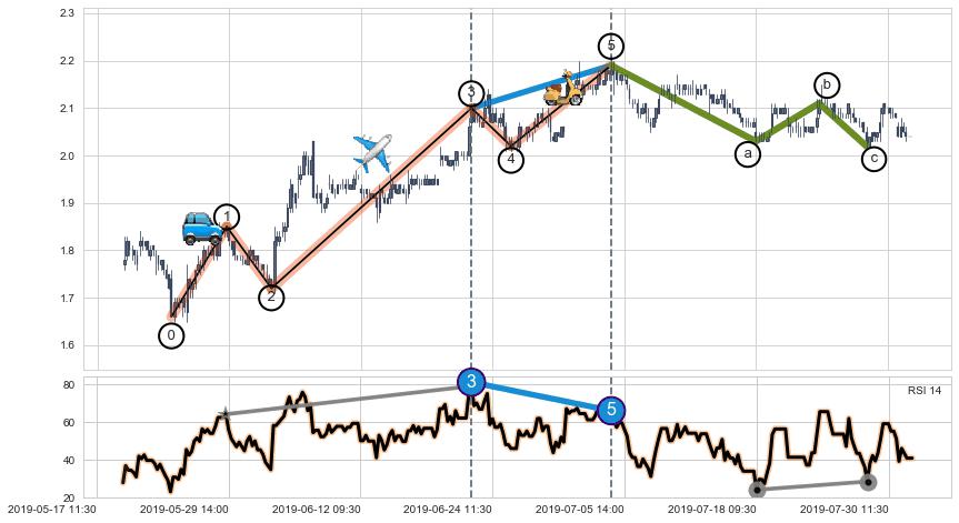 ➣ 【RSI】缠论走势出现【常规背离 & 反转信号】背离程度55.90%,背离夹角角度73.0˚,背离程度较大