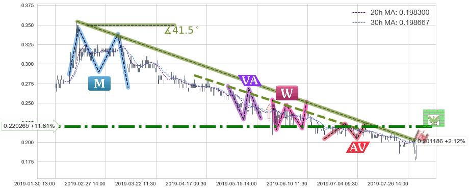 🦴 长线均值回复组合短线趋势跟踪[强阻力信号]2019-02-14 11:30-2019-07-31 15:00下跌趋势依然成立(下跌趋势跟踪依然存在),短线价格略微上行反弹(均值回复猜想),即将接近下跌趋势提供的未破位阻力价格:0.201186。