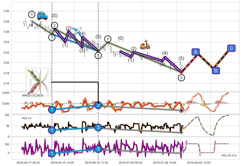 ➢ 1,3,5驱动浪MACD, RSI, KDJ走势都出现【常规背离】反转信号增强