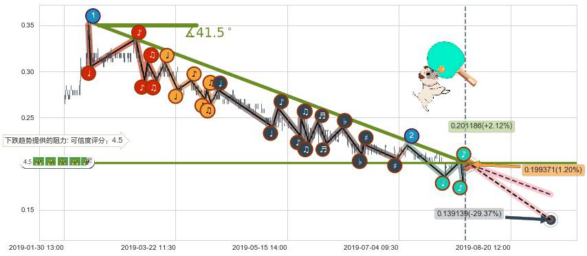 ♘ 在最后的下跌阶段2019-02-14 11:30至2019-07-31 15:00,存在 持续未破位的阻力位 ,阻力价格0.201186,可信任强度86.77%,其距离最后价格0.197000相差 +2.12%