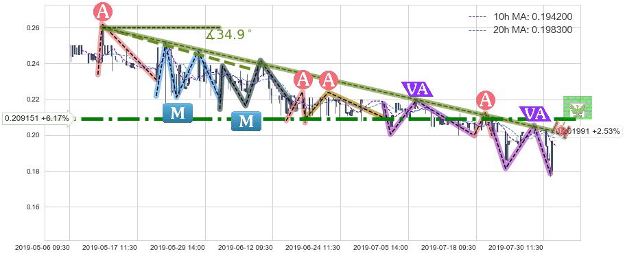 2019-06-20: 时域附近第一阻力位0.209151持续的对下跌趋势进行阻拦,有效地放缓了下跌的速度。