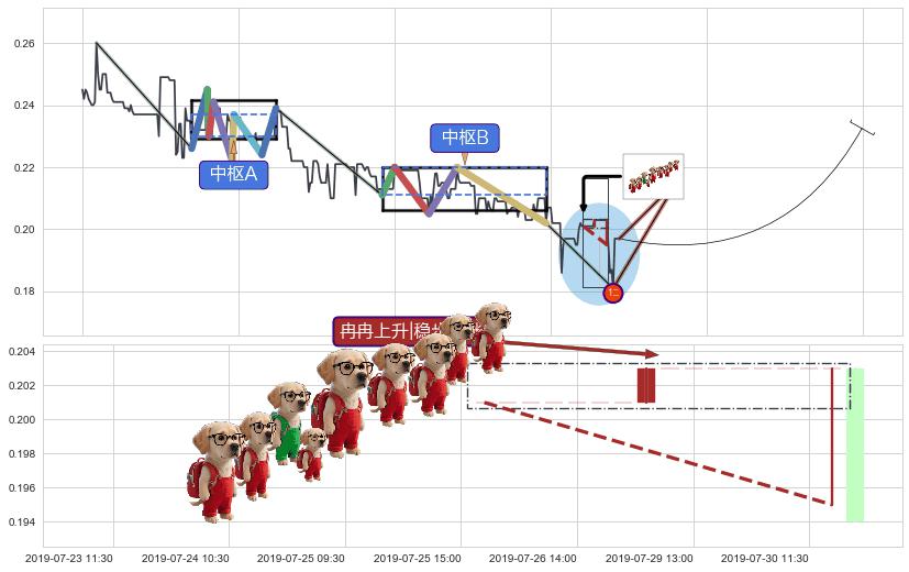 ➣ 【中枢B】:06-25:13-07-22:09,中枢由5笔构成,共106交易小时, ZG=0.220000, ZD=0.211000