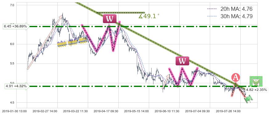 🦴 长线均值回复组合短线趋势跟踪[强阻力信号]2019-03-04 11:30-2019-07-31 15:00下跌趋势依然成立(下跌趋势跟踪依然存在),短线价格略微上行反弹(均值回复猜想),即将接近下跌趋势提供的未破位阻力价格:4.82。