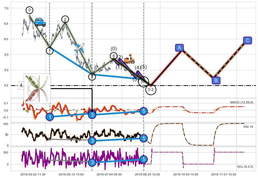 ➣ 1,3,5驱动浪MACD, RSI, KDJ走势都出现【常规背离】反转信号增强
