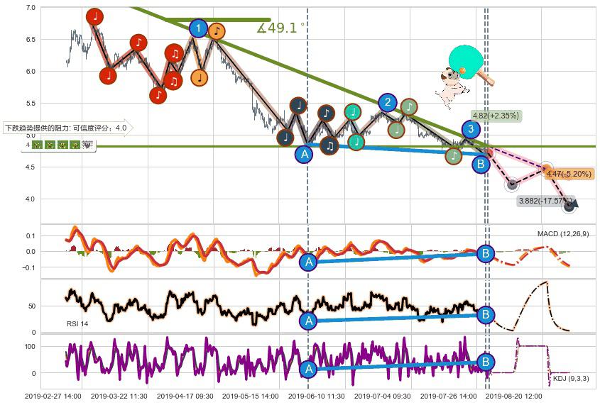➣ 预测:2019-08-21 13:00,【试探阻力】稳定目前下跌趋势的前提下,预测价格:4.47