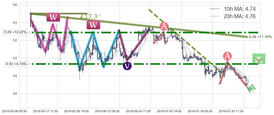 ♘ 阻力价格位4.93,可信任强度85.84%,距离最后交易2019-07-31 15:00形成的收盘价格4.71相差 +4.73%