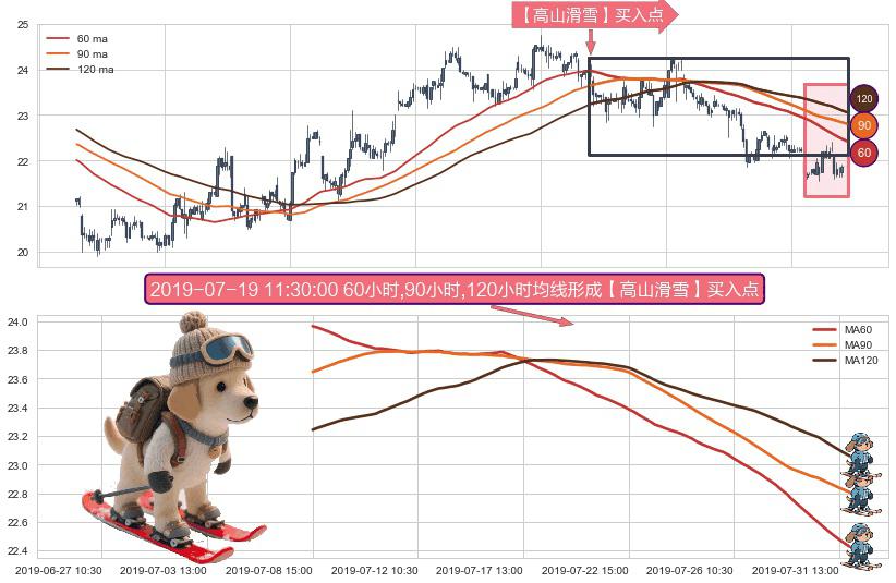 ⚀ 2019-07-08 15:00:00小时-2019-07-31 15:00:00小时显现 60小时-90小时-120小时均线 【高山滑雪】买入点 看多信号,后市看涨,买入