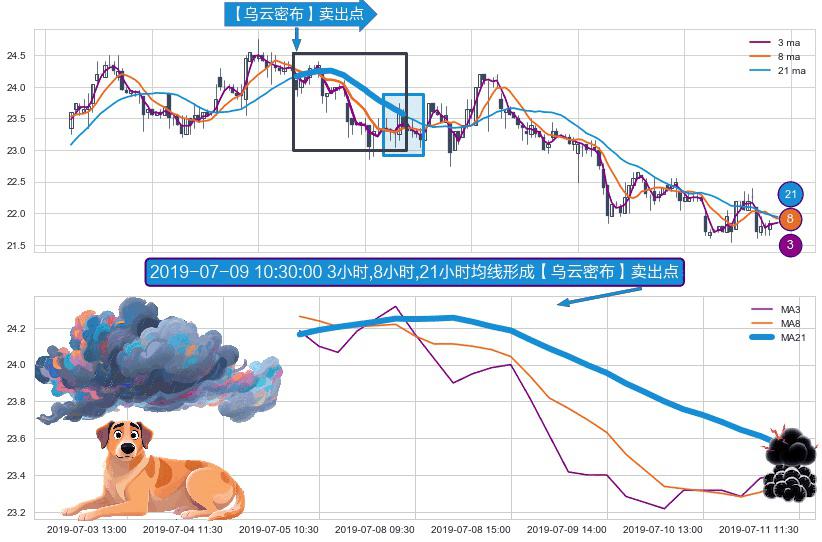 ⚀ 2019-07-05 09:30:00小时-2019-07-11 10:30:00小时显现 3小时-8小时-21小时均线 【乌云密布】卖出点 看空信号,后市看跌,卖出