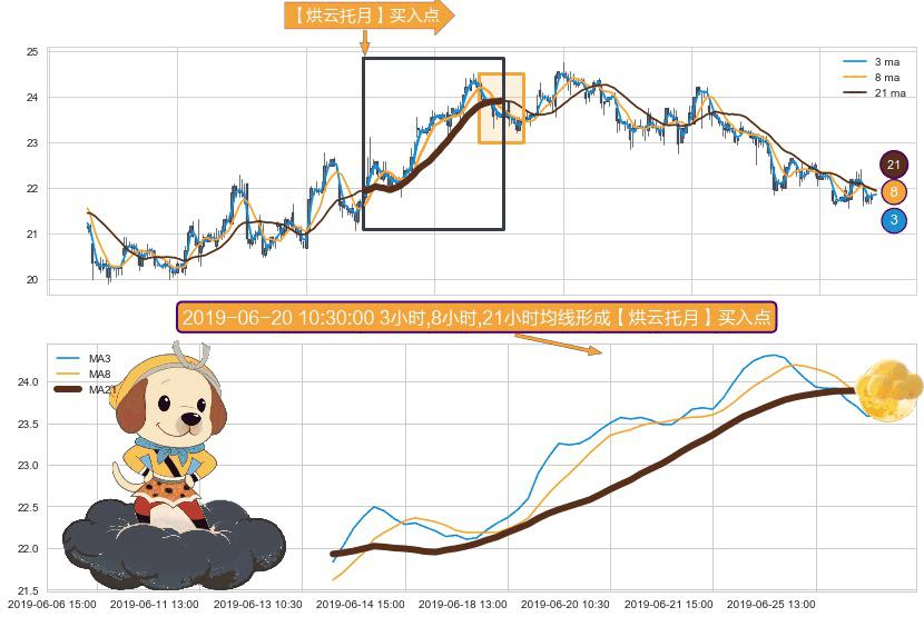 ⚀ 2019-06-13 14:00:00小时-2019-06-26 13:00:00小时显现 3小时-8小时-21小时均线 【烘云托月】买入点 看多信号,后市看涨,买入