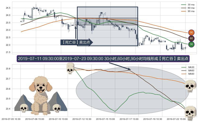 ⚀ 2019-07-11 10:30:00-小时至2019-07-23 09:30:00-小时显现 30小时-60小时-90小时均线 【死亡谷】卖出点 看空信号,后市看跌,卖出