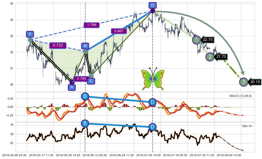 ➣ 已完成【蝴蝶】形态起点X: 05-07:09, 终点D: 07-03:10, 共230交易小时