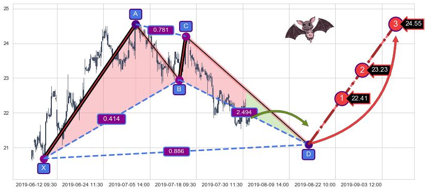 ➢ 接近预测D点位置, 随时警戒看涨【蝙蝠】形态反转启动