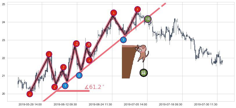 从2019-07-03 10:30至2019-07-30 14:00,共包含118个小时,阶段股价下跌-9.67%,阶段股价变动位移路程比: 1 : 6,下跌趋势角度: 56.7