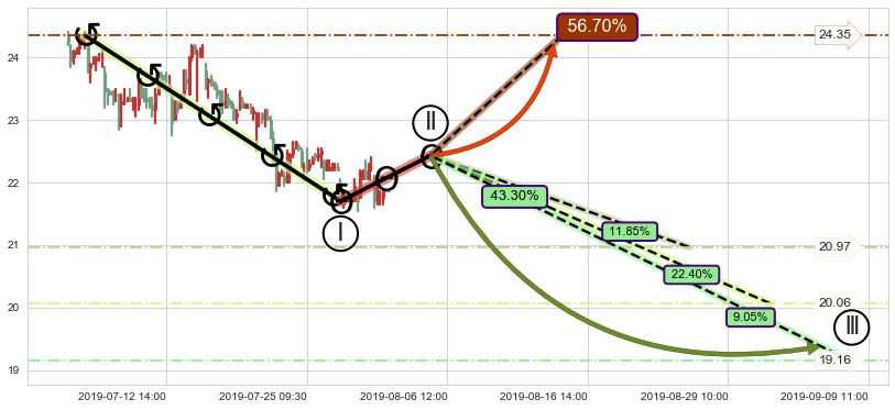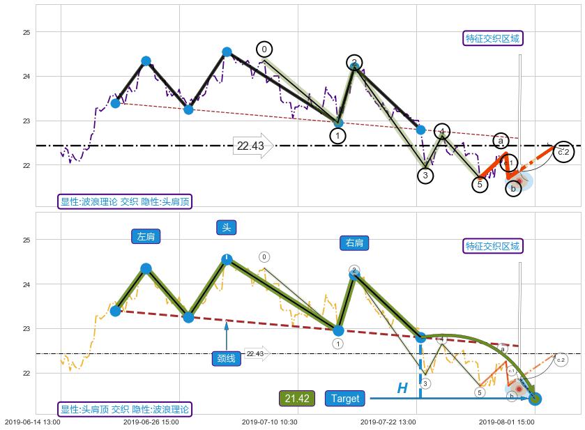 从2019-07-16 10:30至2019-07-30 14:00,共包含64个小时,阶段股价下跌-8.44%,阶段股价变动位移路程比: 1 : 3,下跌趋势角度: 46.0