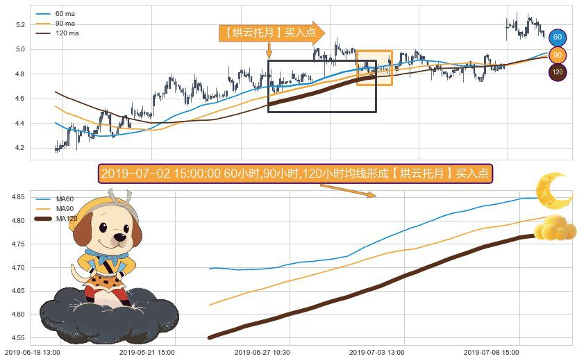 形态多维评估: ⚀ 2019-06-24 15:00:00小时-2019-07-09 14:00:00小时显现 60小时-90小时-120小时均线 【烘云托月】买入点 看多信号,后市看涨,买入