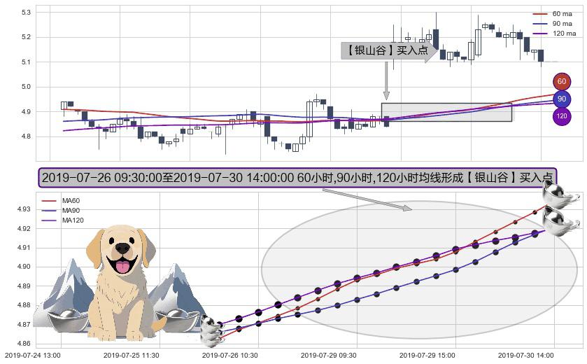 形态多维评估: ⚀ 2019-07-26 10:30:00-小时至2019-07-30 14:00:00-小时显现 60小时-90小时-120小时均线 【银山谷】买入点 看多信号,后市看涨,买入