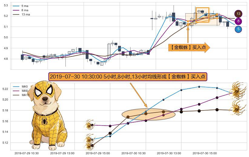 形态多维评估: ⚀ 2019-07-30 10:30:00小时显现 5小时-8小时-13小时均线 【金蜘蛛】买入点 看多信号,后市看涨,买入