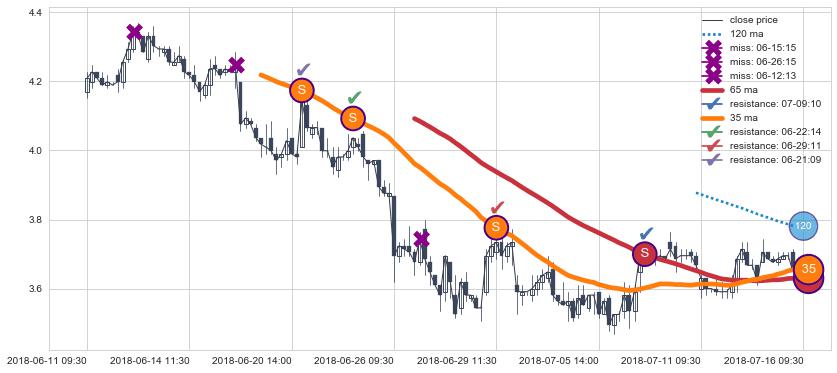 下跌趋势06-11 09:30-07-16 09:30,均线65, 35确认关键阻力4处