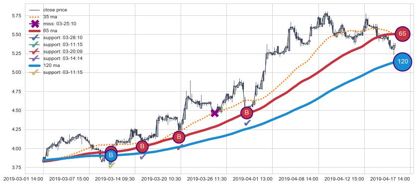 上涨趋势03-01 14:00-04-17 14:00,均线120, 65确认关键支撑4处