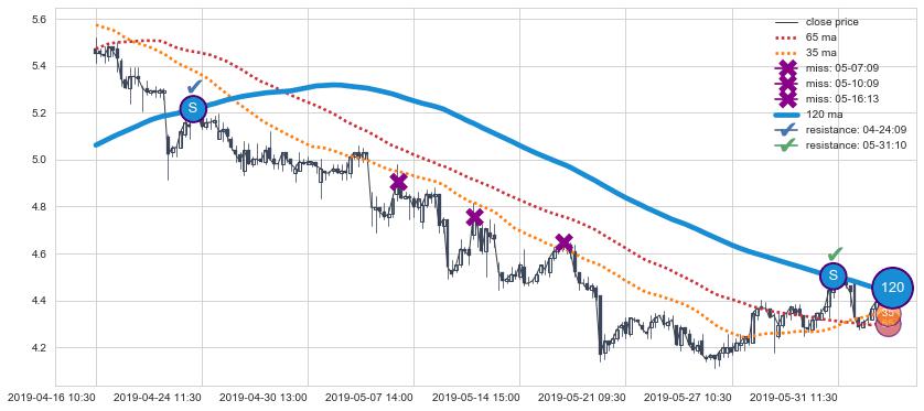 下跌趋势04-16 10:30-06-03 15:00,均线120确认关键阻力2处