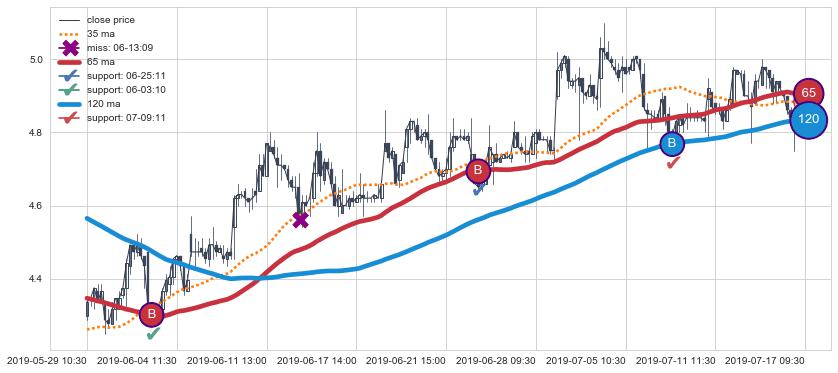 上涨趋势05-29 10:30-07-17 09:30,均线120, 65确认关键支撑3处