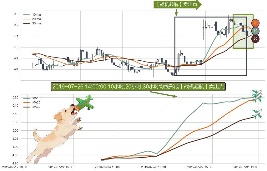 形态多维评估: ⚀ 2019-07-23 15:00:00小时-2019-07-31 11:30:00小时显现 10小时-20小时-30小时均线 【战机起航】卖出点 看空信号,后市看跌,卖出
