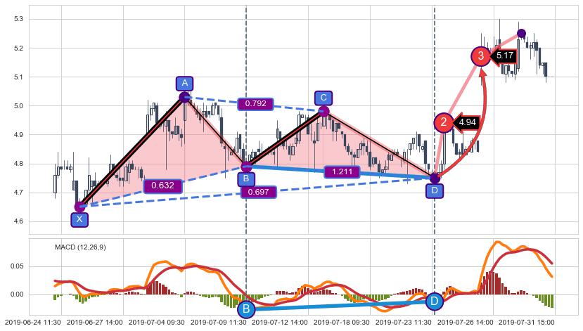 ➢ 谐波价格D点比B点低 ⤵,【MACD】指标D点比B点高 ⤴️