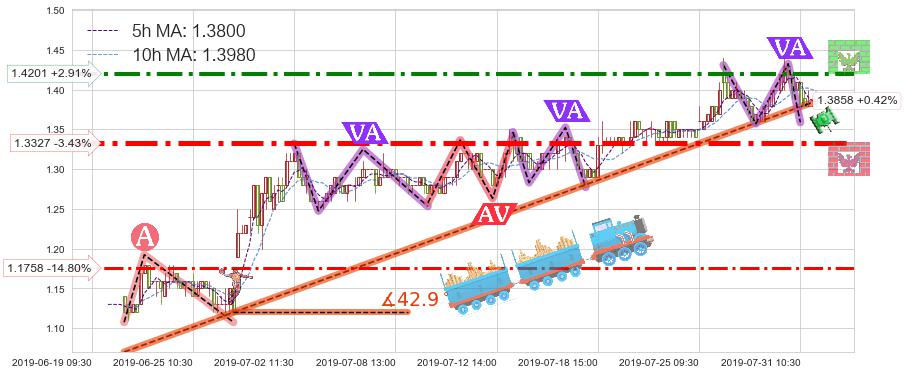 ♘ 阻力价格位1.4201,可信任强度72.69%,距离最后交易2019-07-31 15:00形成的收盘价格1.3800相差 +2.91%