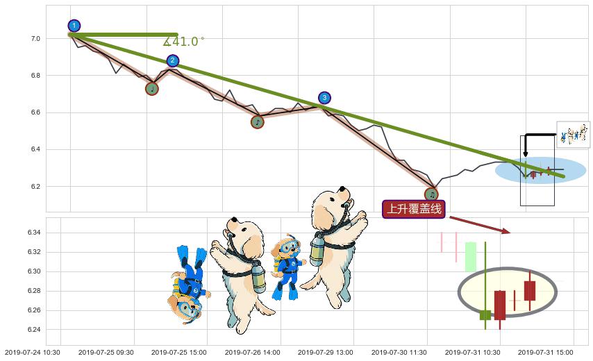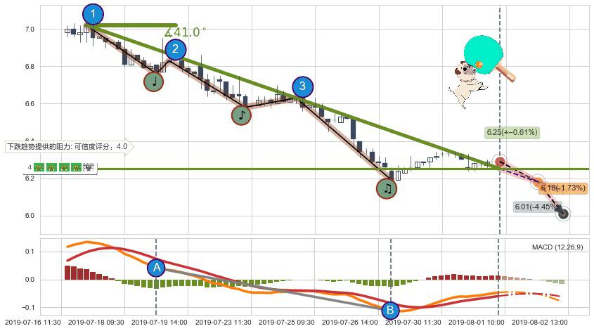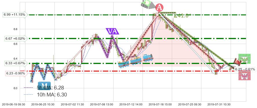 🦴 长线均值回复组合短线趋势跟踪[强阻力信号]2019-07-17 09:30-2019-07-30 09:30下跌趋势依然成立(下跌趋势跟踪依然存在),短线价格略微上行反弹(均值回复猜想),即将接近下跌趋势提供的未破位阻力价格:6.25。
