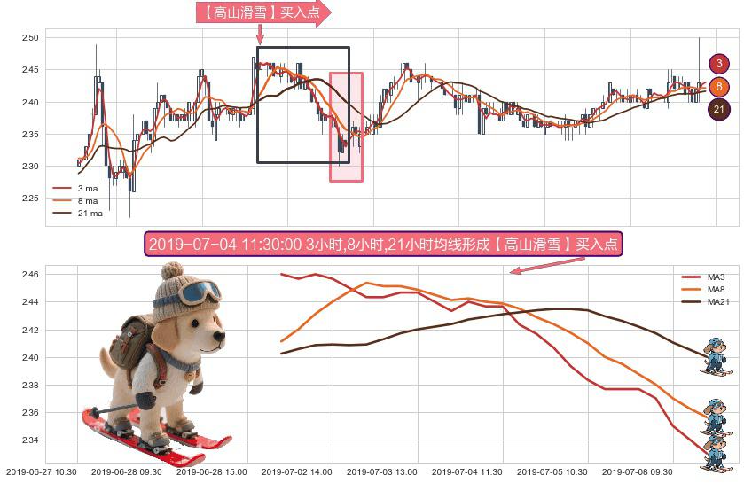 ⚀ 2019-07-02 10:30:00小时-2019-07-08 11:30:00小时显现 3小时-8小时-21小时均线 【高山滑雪】买入点 看多信号,后市看涨,买入