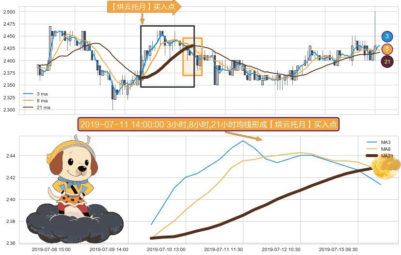 ⚀ 2019-07-10 09:30:00小时-2019-07-15 11:30:00小时显现 3小时-8小时-21小时均线 【烘云托月】买入点 看多信号,后市看涨,买入
