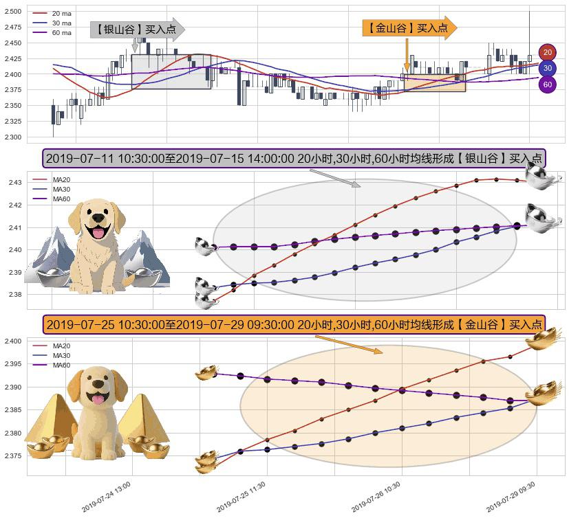 ⚀ 2019-07-25 11:30:00-小时至2019-07-29 09:30:00-小时显现 20小时-30小时-60小时均线 【金山谷】买入点 其再次确认了买入信号,可靠性更强,买入