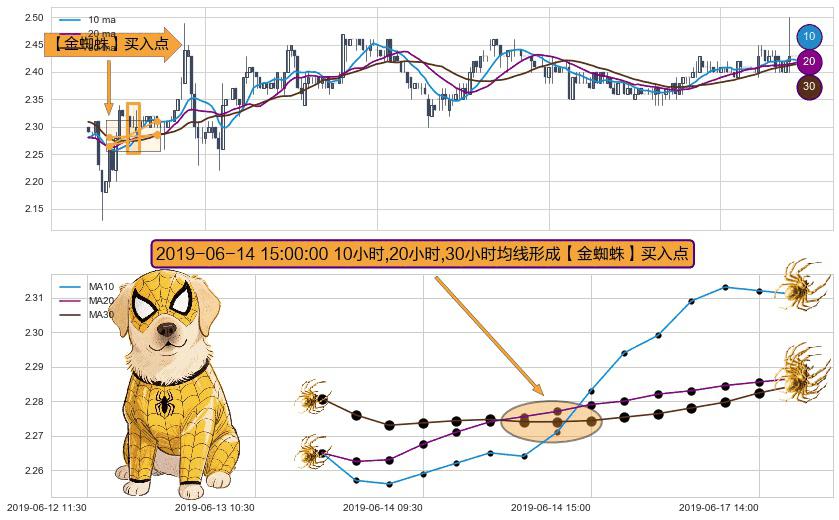 ⚀ 2019-06-14 15:00:00小时显现 10小时-20小时-30小时均线 【金蜘蛛】买入点 看多信号,后市看涨,买入