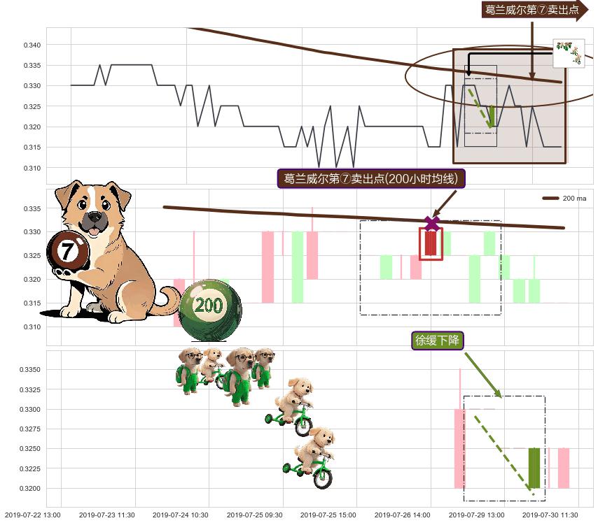 ♘ 在最后的下跌阶段2019-03-22 15:00至2019-07-23 14:00,存在 持续未破位的阻力位 ,阻力价格0.33925,可信任强度79.67%,其距离最后价格0.31500相差 +7.70%