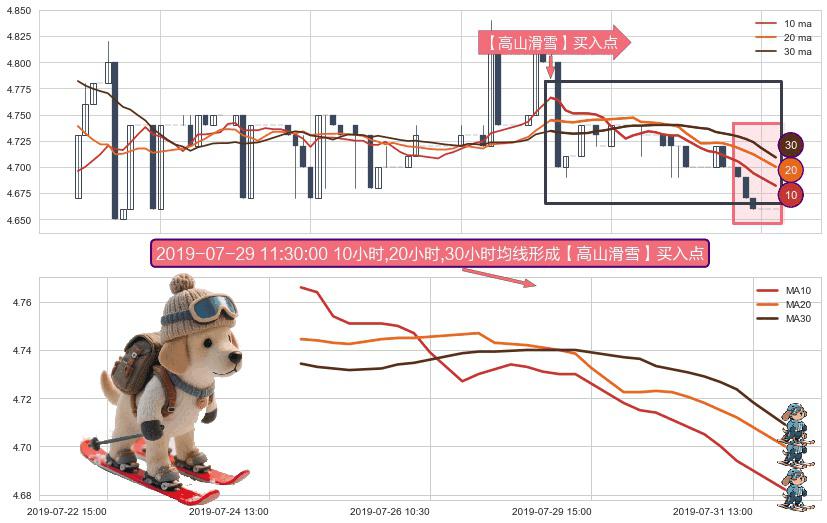 形态多维评估: ⚀ 2019-07-24 15:00:00小时-2019-07-31 15:00:00小时显现 10小时-20小时-30小时均线 【高山滑雪】买入点 看多信号,后市看涨,买入