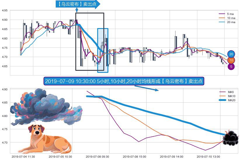 形态多维评估: ⚀ 2019-07-05 13:00:00小时-2019-07-10 14:00:00小时显现 5小时-10小时-20小时均线 【乌云密布】卖出点 看空信号,后市看跌,卖出