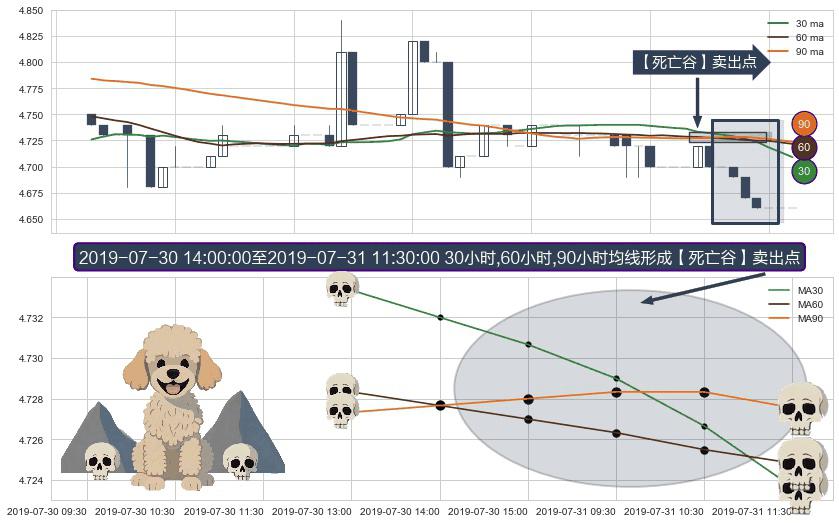 形态多维评估: ⚀ 2019-07-30 15:00:00-小时至2019-07-31 11:30:00-小时显现 30小时-60小时-90小时均线 【死亡谷】卖出点 看空信号,后市看跌,卖出