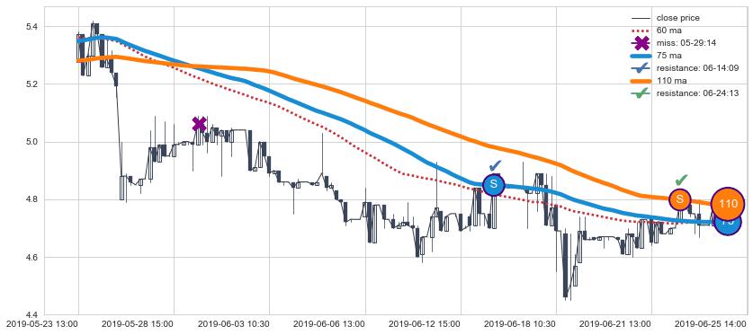 下跌趋势05-23 13:00-06-25 14:00,均线75, 110确认关键阻力2处