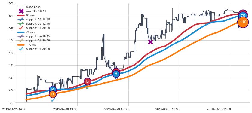 上涨趋势01-23 14:00-03-18 15:00,均线75, 60, 110确认关键支撑3处