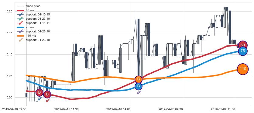 上涨趋势04-10 09:30-05-02 14:00,均线75, 60, 110确认关键支撑3处