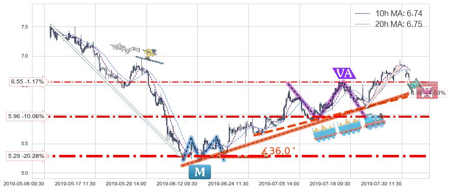 ♘ 支撑价格位5.96,可信任强度77.88%,距离最后交易2019-07-31 15:00形成的收盘价格6.63相差 -10.06%