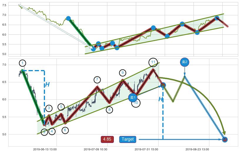 从2019-07-22 13:00至2019-07-31 15:00,共包含45个小时,阶段股价上涨8.35%,阶段股价变动位移路程比: 1 : 2