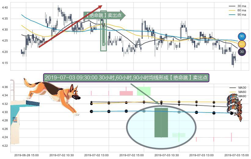 形态多维评估: ⚀ 2019-07-03 09:30:00小时显现 30小时-60小时-90小时均线 【绝命跳】卖出点 看空信号,后市看跌,卖出