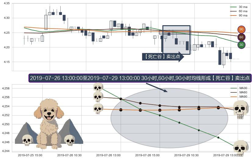 形态多维评估: ⚀ 2019-07-26 14:00:00-小时至2019-07-29 13:00:00-小时显现 30小时-60小时-90小时均线 【死亡谷】卖出点 看空信号,后市看跌,卖出
