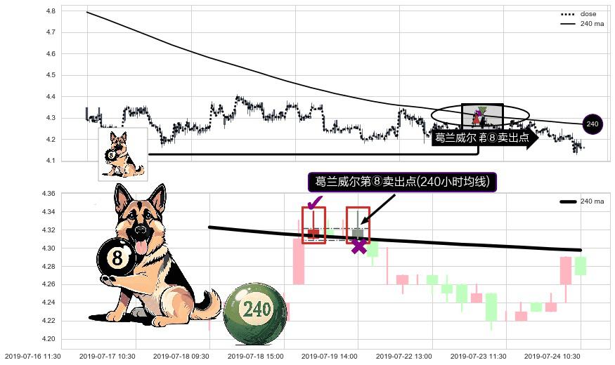 形态多维评估: ⚀ 2019-07-19 14:00:00-小时显现 葛兰威尔均线 240小时均线 第⑧卖出点 下降趋势的中继信号,后市看跌,卖出信号