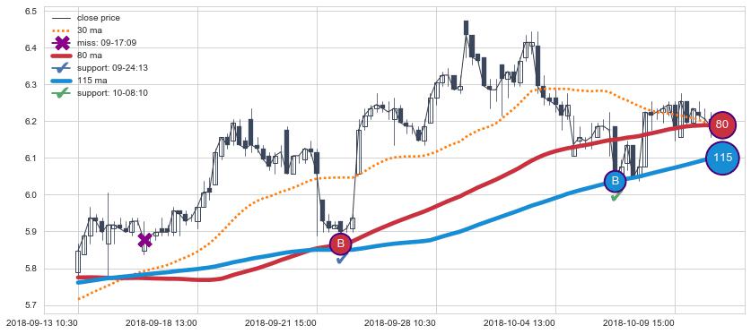 上涨趋势09-13 10:30-10-10 15:00,均线80, 115确认关键支撑2处