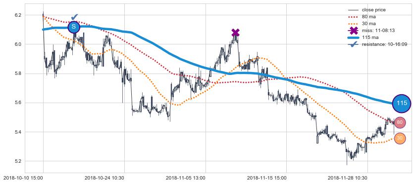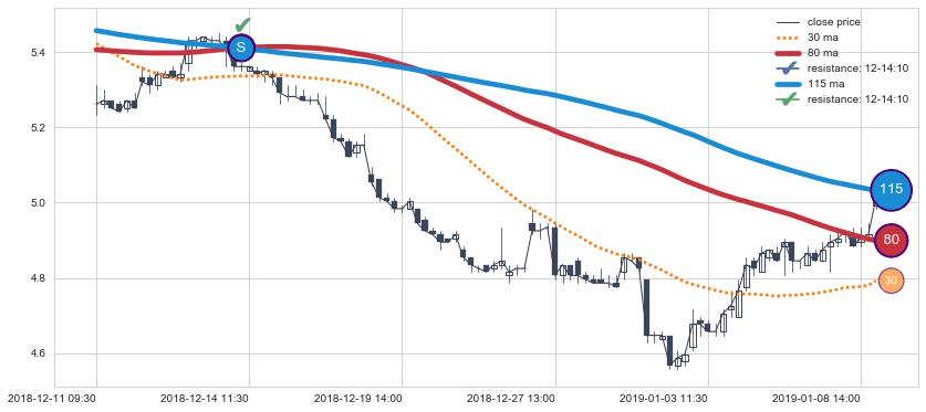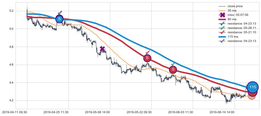 下跌趋势04-11 09:30-06-19 11:30,均线80, 115确认关键阻力3处
