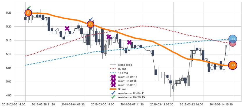 下跌趋势02-22 10:30-03-14 10:30,均线30确认关键阻力2处